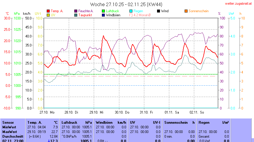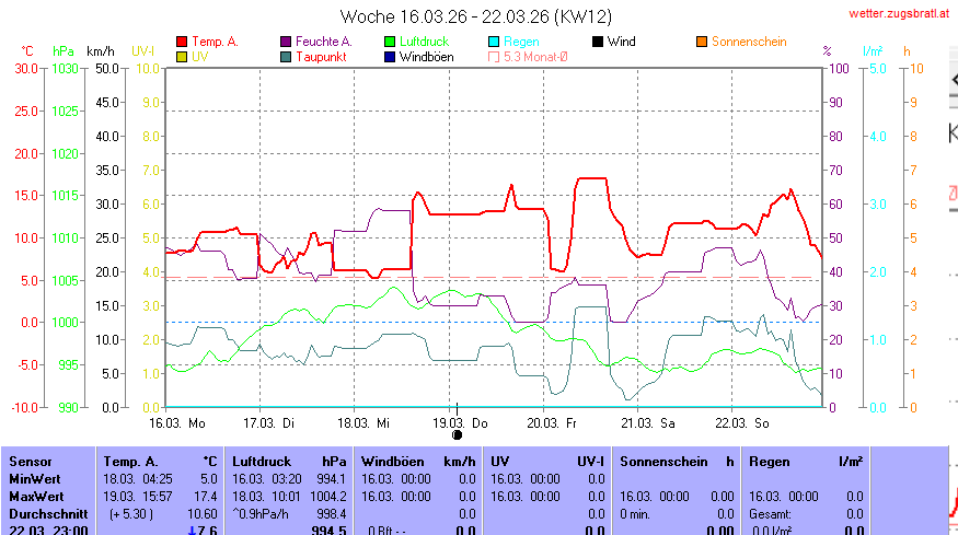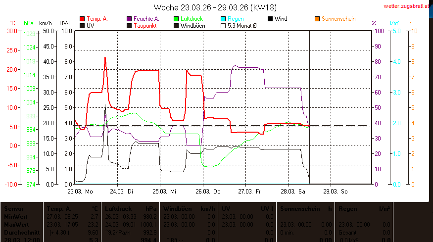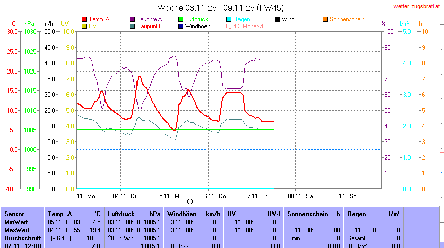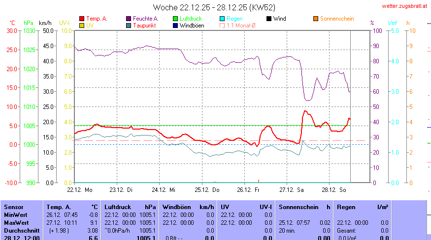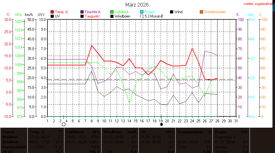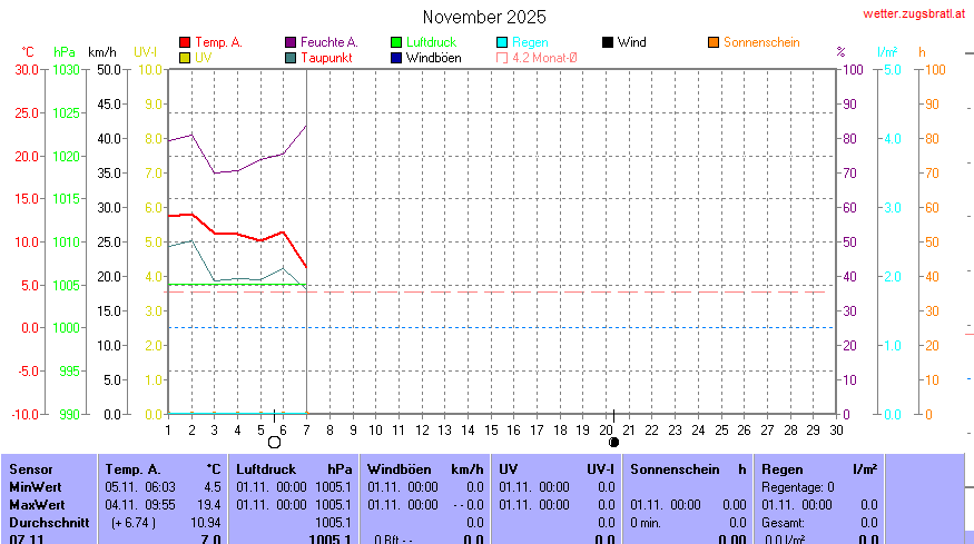 | Die dargestellten Werte repräsentieren die Daten des aktuellen Tages! Der Luftdruck ist auf Meereshöhe bezogen! |